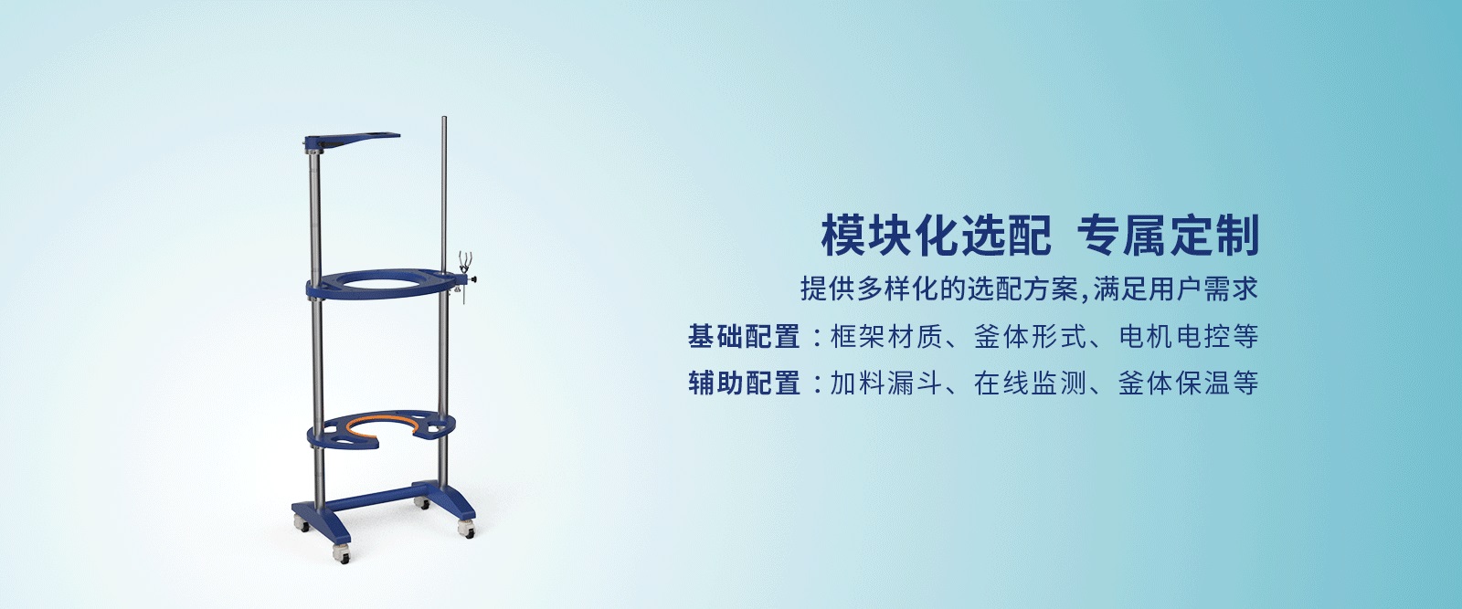 8、模塊化選配,提供多樣化的選配方案,滿足用戶需求。基礎配置:框架材質(zhì),釜體形式,電機電控等。輔助配置:加料漏斗,在線監(jiān)測,釜體保溫等。
