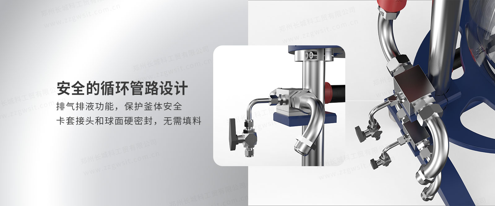 5、循環(huán)管路設計安全:排氣排液功能,保護釜體安全,卡套接頭和球面硬密封,無需填料;