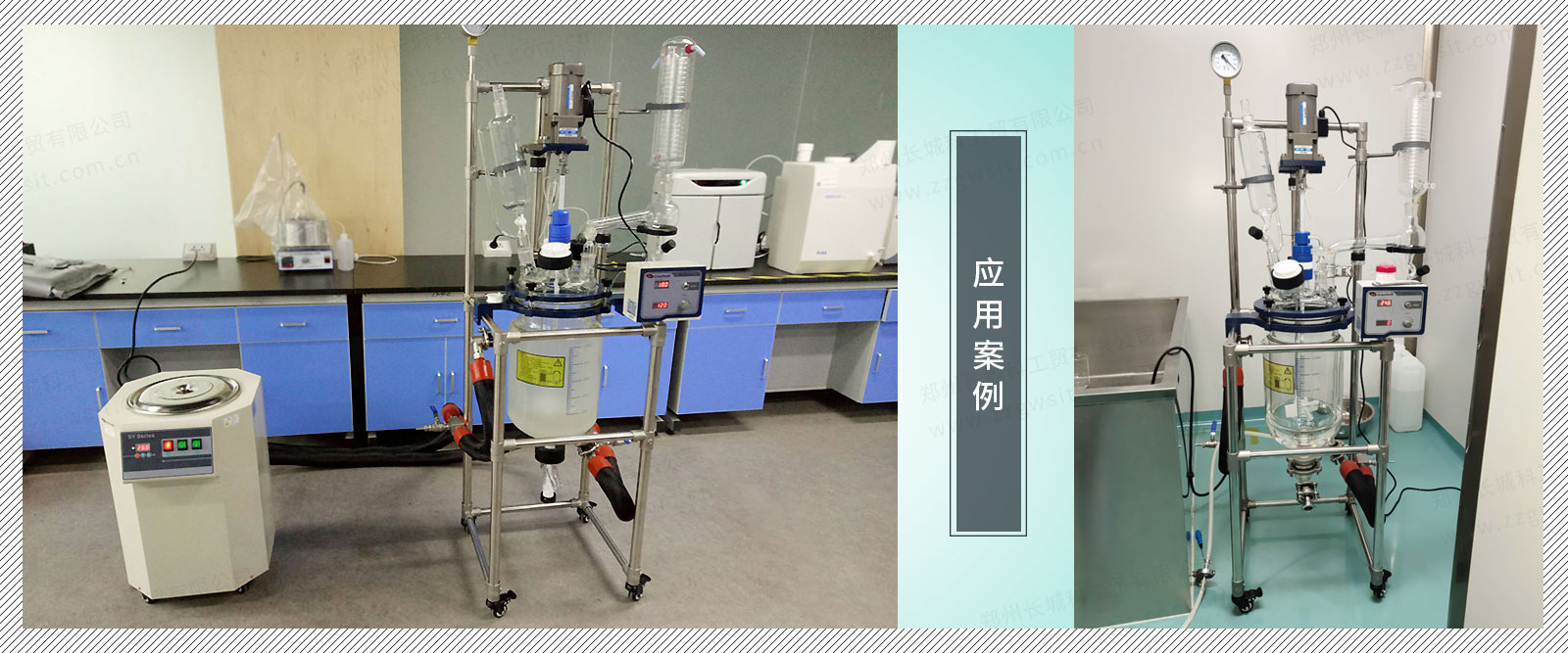 在玻璃內層放入反應溶媒可做攪拌反應,夾層可通上不同的冷熱源(冷凍液,熱水或熱油)做循環加熱或冷卻反應。通過雙層反應釜夾層,注入恒溫的(高溫或低溫)熱溶媒體或冷卻媒介,對內的物料進行恒溫加熱或制冷。同時可根據使用要求在常壓或負壓條件下進行攪拌反應。物料在反應釜內進行反應,并能控制反應溶液的蒸發與回流,反應完畢,物料可從釜底的出料口放出。
